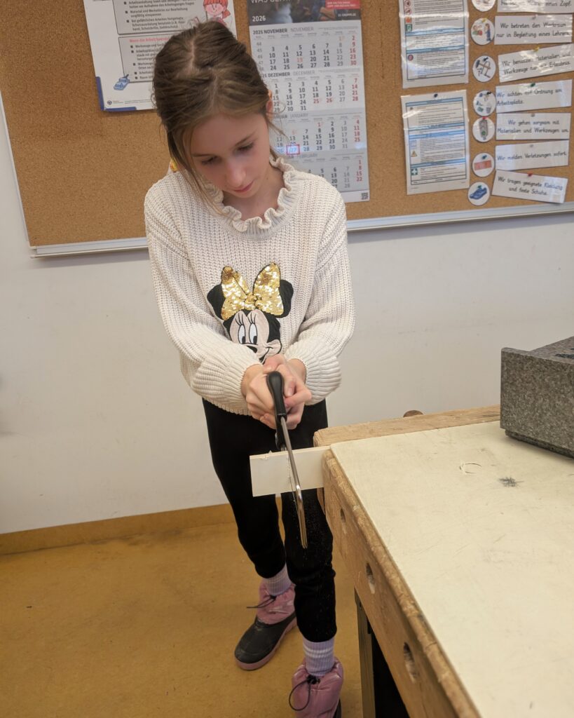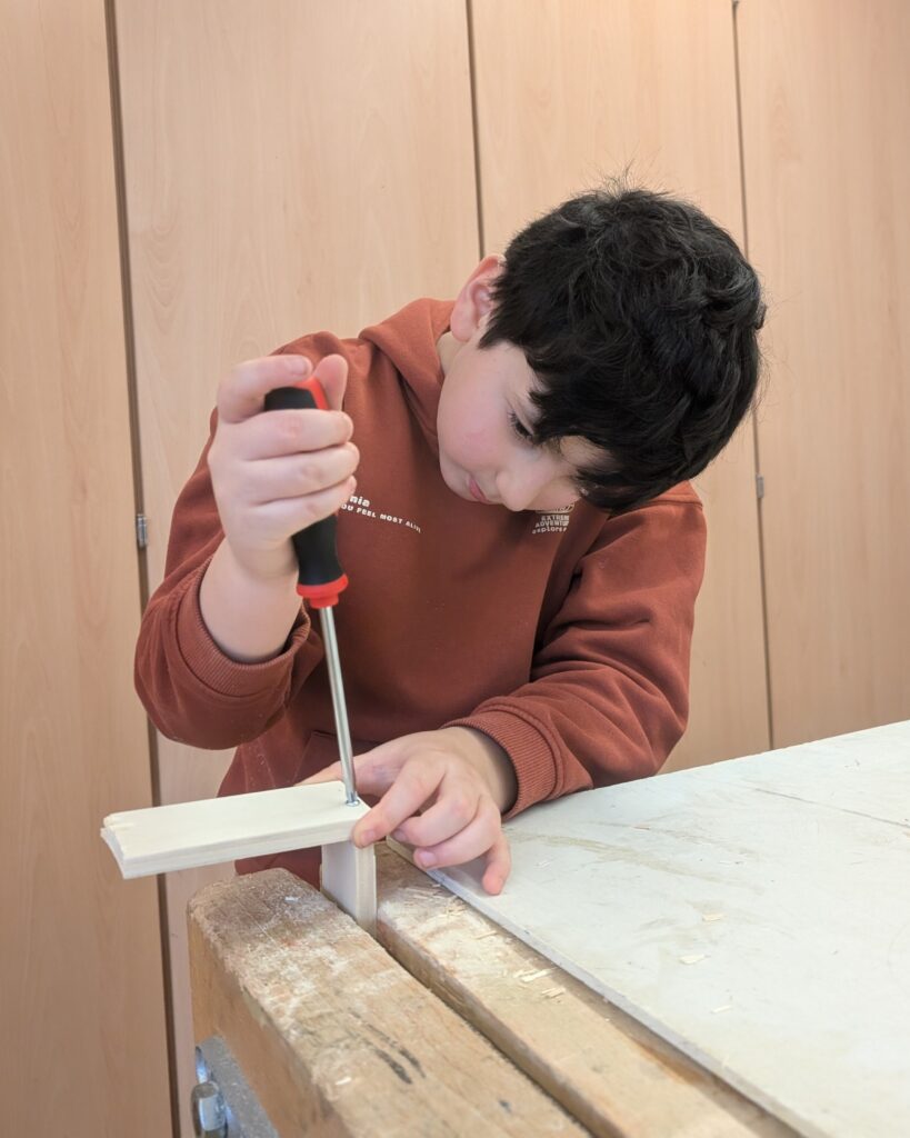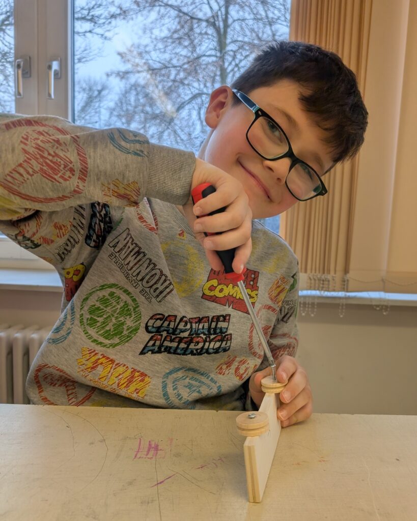 Denn natürlich gibt es auch Hürden: Komplexe Bauideen und räumliches Denken stellen die Kinder mitunter vor Herausforderungen. Ungeplantes Sägen führt manchmal zu zu langen oder zu kurzen Werkstücken und auch Materialprobleme wie splitterndes Sperrholz gehören dazu. Doch entscheidend ist, dass dabei kein Frust entsteht. Statt „Kann ich nicht“ hört Frau Bär inzwischen häufiger „Wie geht das?“.